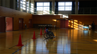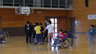 5年生で福祉実践教室を行いました。体育館で講義を受けたあと、車いす、点字、視覚障害者ガイドヘルプ、高齢者疑似体験、手話の5つの講座に分かれて体験を行いました。体験を通して障害のある人の苦労を感じたり、自分たちにできることを考えたりしました。