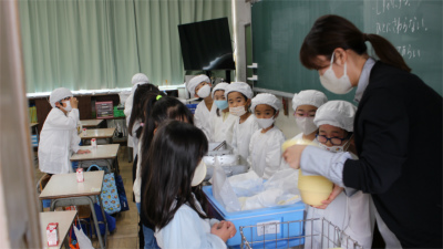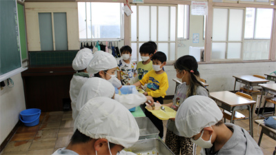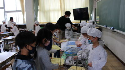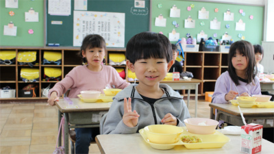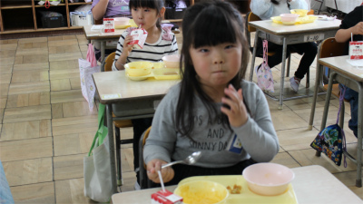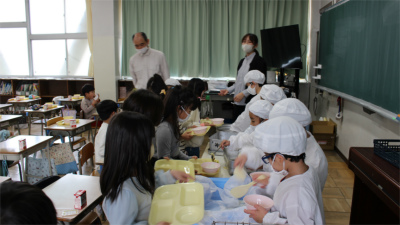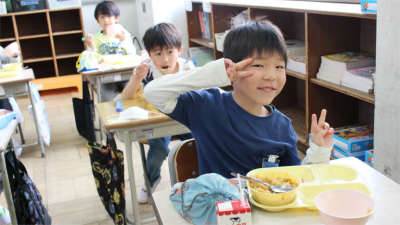 本日、1年生になって初めての給食が始まりました。準備の時間には、先生の話をしっかり聞いて、自分たちで一生懸命配膳の準備をしました。今日の献立は、みんなが大好きな「米粉のカレーライス」です。「おいしい!」と笑顔いっぱいで頬張る姿が、教室のあちこちで見られました。たくさん食べて、元気いっぱいの学校生活を送りましょう。