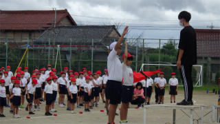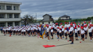 運動会の全校練習を行い、開会式と閉会式の流れを確認しました。元気よく運動会の歌を歌ったり、結果発表で大きな声で勝利を喜んだり、紅組白組ともに団結した姿が見られました。